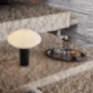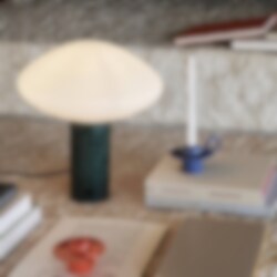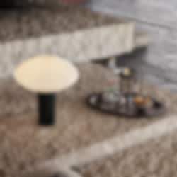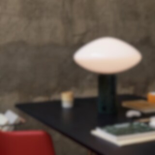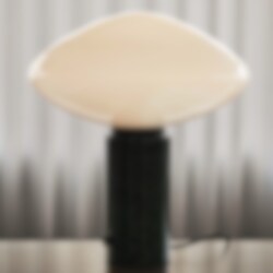 Bordslampan Mist är tillverkad av munblåst opalglas med en fot i tjock marmor med en liten dimmer. Kontrasten mellan glasets ljusa form och marmorns soliditet skapar en elegant design.