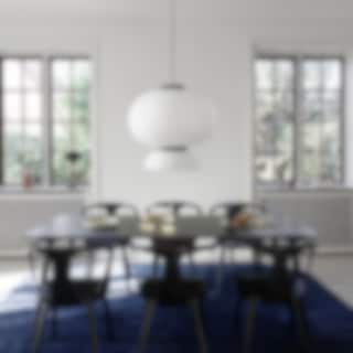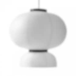 Design: Jamie Hayon 2015. Pendant JH5, pendel från &Tradition. Väst möter öst i formgivaren Jamie Hayons tolkning av den klassiska rislampan. De vackra lamporna görs för hand och är i elfenbensvitt rispapper med detaljer av svartbetsad ek. Formakami har två ljuskällor - en i den övre delen och en i den nedre delen. Detta gör att pendlarna både skapar ett mjukt, allmänt sken samtidigt som de ger ett användbart nedåtriktat ljus. Formakami Pendant kommer i tre olika utföranden.