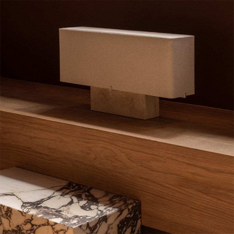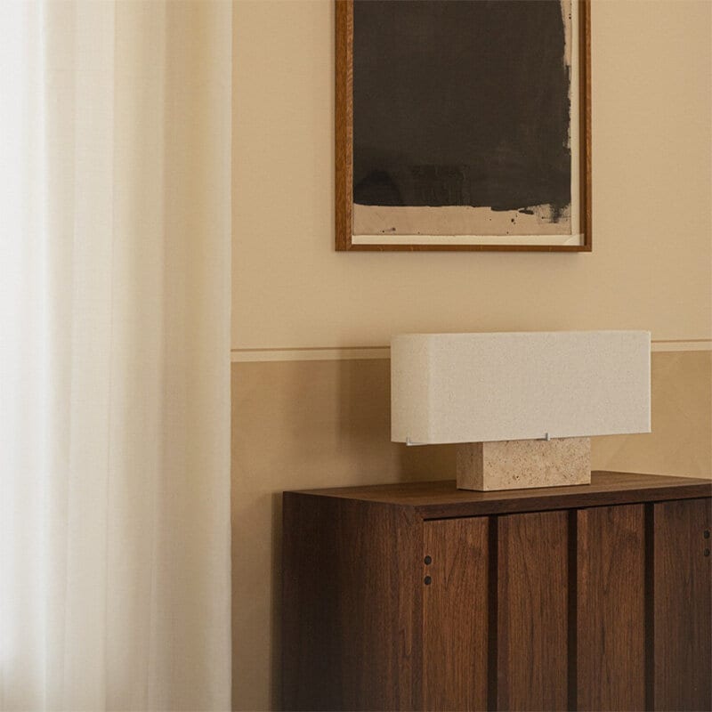 Design: Kroyer-Saetter-Lassen.Nonna bordslampa i travertin förenar skulptural närvaro med nedtonad elegans – en modern men samtidigt tidlös tolkning av klassisk design. Lampans varma travertinbas kombineras med en sandfärgad textilskärm som sprider ett mjukt, stämningsfullt ljus och skapar en känsla av lugn och harmoni.