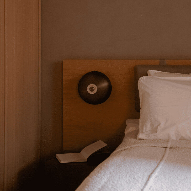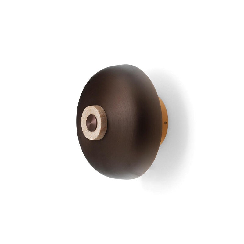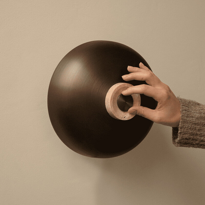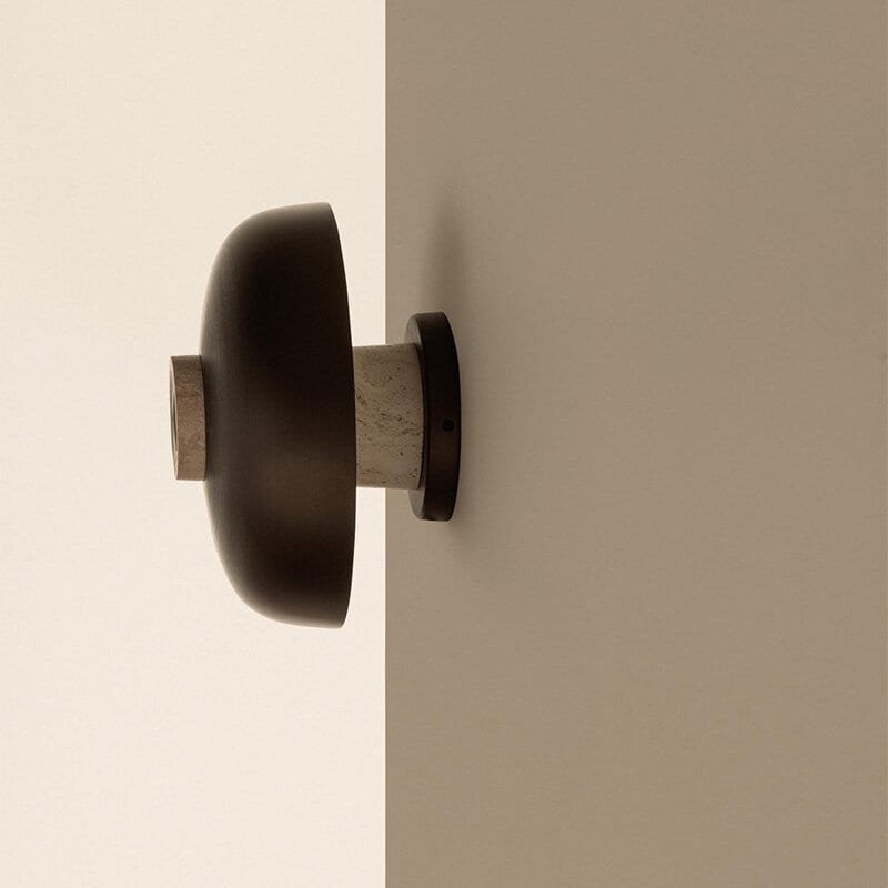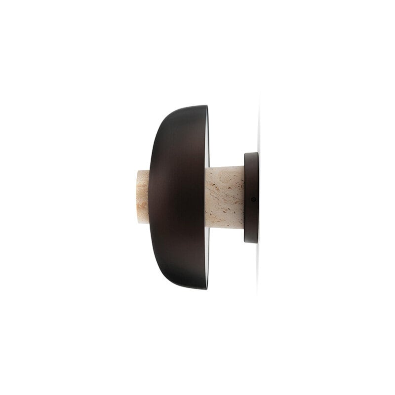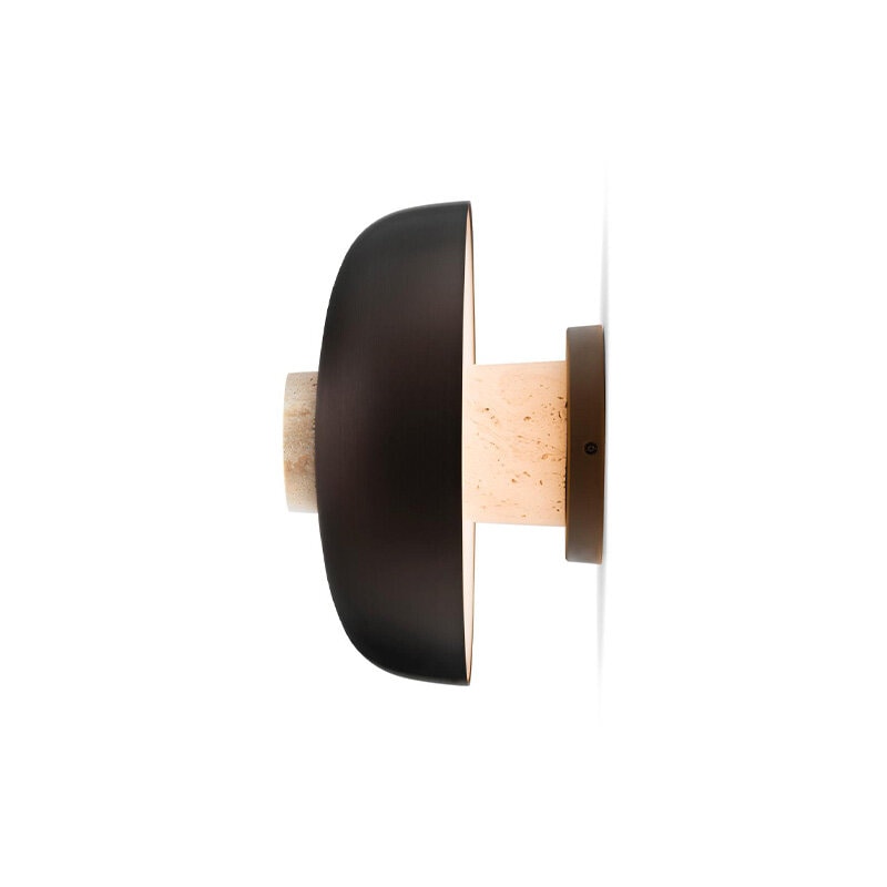 Design: Aleksandar Lazic, 2025. Reverse Wall Lamp är en fascinerande kombination av råa, naturliga material och elegant hantverk, inspirerad av den balans och spänning som geometriska former skapar. Lampans väggfäste i obehandlad travertinsten har en konisk form där stenens naturliga variationer framhävs, vilket gör varje exemplar unikt. Den böjda lampskärmen i anodiserad aluminium ger en stilren kontrast med sin släta, polerade yta.
