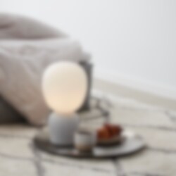 Buddy är en rolig lampa i minimalistisk design med mjuka former som hittar sin plats var som helst, som i fönstret, på en hylla eller ett bord. Den opalfärgade glasskärmen sprider ett varmt och fint ljus. Du kan välja bland flera olika färger på lampfoten.
