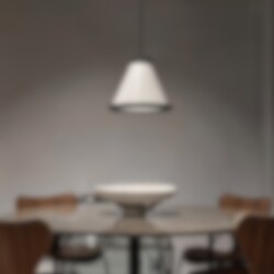 Lampan är designad med en genomtänkt balans mellan aluminiumringar, en trycksvarvad kon och ett opalt bländskydd, vilket skapar en sammanhängande helhet och en känsla av tyngd. Den dolda LED-ljuskällan är dimbar och ger ett behagligt, jämnt ljus utan att blända.