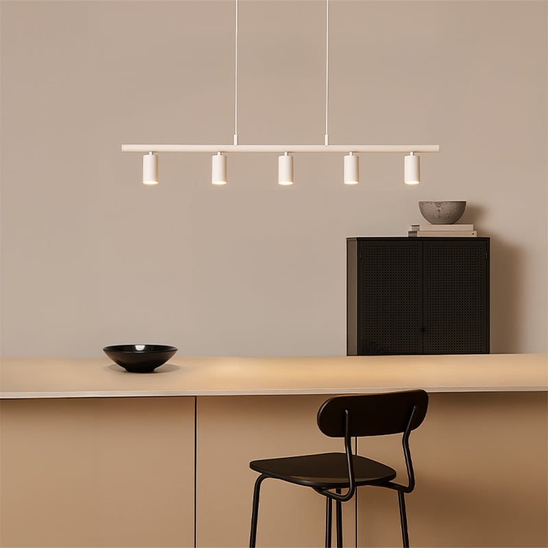 Lucy är en modern, linjär pendel med fem riktbara spotlights, perfekt anpassad för placering över köksön eller matbordet. Den stilrena formen ger ett jämnt och funktionellt ljus samtidigt som den bidrar till ett modernt uttryck i rummet. Pendeln är utrustad med fem GU10-socklar, vardera med en maximal effekt på 5 W, och kan dimras för att enkelt anpassa ljusstyrkan efter tillfälle och behov.