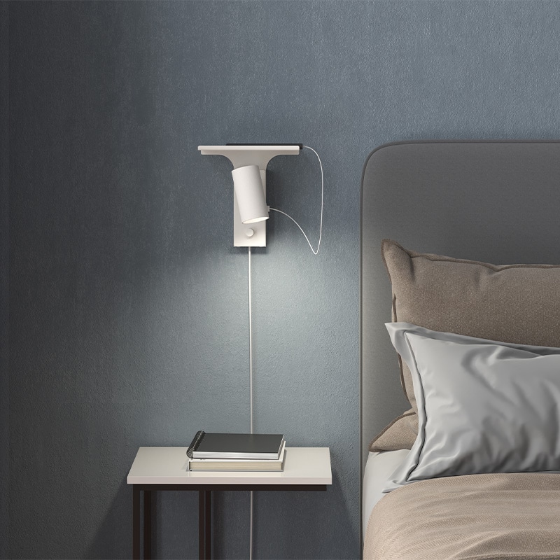 Tyson vägglampa kombinerar elegant design med smart funktion. Det justerbara lamphuvudet ger riktat ljus precis där du behöver det, och USB-C-porten på höger sida gör det enkelt att ladda dator och mobila enheter direkt vid sängen. Som praktisk sänglampa är Tyson skapad för sovrummet, där form och funktion möts. En matchande hylla finns som tillbehör – perfekt för att lägga ifrån sig mobilen, boken eller väckarklockan inom bekvämt räckhåll.