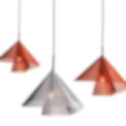 Diffus, designad av Kajsa Pettersson, är en takpendel i bockad aluminium som hålls samman av en läderknut och skapar ett fjäderlätt intryck. Diffus finns i flera färger och två storlekar.