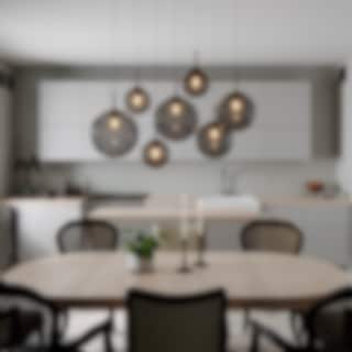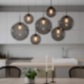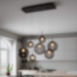 Upptäck taklampan Laura, en imponerande kombination av modern design och klassisk elegans. Tillverkad av matt svart metall med stilrena mässingsdetaljer, utstrålar denna lampa en tidlös charm. Den är försedd med sju glaskupor i ljusgrått i olika storlekar, vilka enkelt monteras. De svarta textilkablarna ger inte bara en praktisk funktion utan bidrar också till lampans sofistikerade estetik.