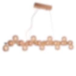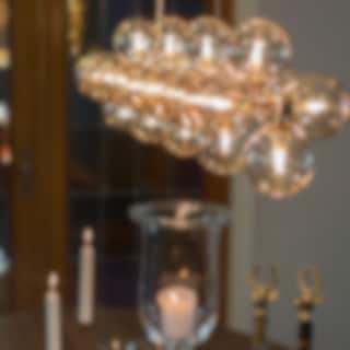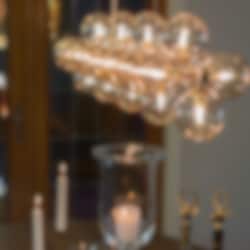 En modern variant på den klassiska ljuskronan här med 24 st kulor i amberfärgat glas symmetriskt fästa på en mässingsfärgad metallstav. Den ger ett fantastisk varmt sken och passar bra i vardagsrummet eller över köksbordet.