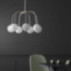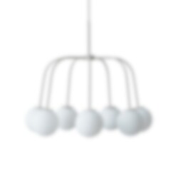 En elegant taklampa i modern design som är en fin detalj och passar i hemmets alla rum. Den har sju armar, försedd med lika många ljuskällor med vita glaskulor som sprider ett mjukt varmt sken.