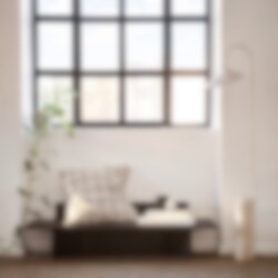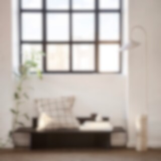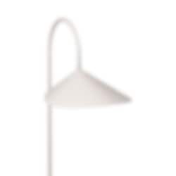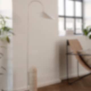 Arum golvlampa kännetecknas av den svarta massiva marmorbasen i kombination med den organiskt formade lampskärmen. Den lövliknande skärmen "hänger" som ett blad på den böjda metallbågen och skapar en fin balans mellan den tunga basen och den annars enkla rena formgivningen. Med den matta, benvita insidan av skärmen ger lampan ett mjukt, jämnt fördelat ljus, och lampskärmen kan justeras för att säkerställa optimala ljusförhållanden.