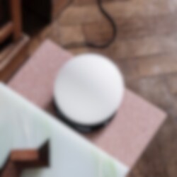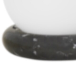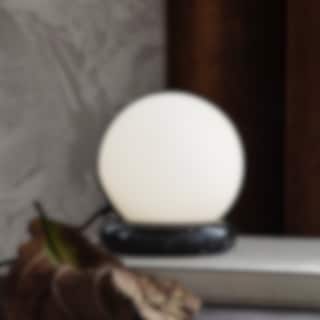 Den matta opala glaskulan vilar på en ring av massiv svart marmor som lyser upp sin omgivning med sitt mjuka ljus.