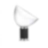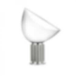 Taccia är en designikon från 60-talet som ger både indirekt och reflekterat ljus. Skärmen är i munblåst transparent glas och metallreflektor i högblank vit yta. Fot i svart eller anodiserad aluminium i svart, silver brons eller violett och med nickelpläterad fotplatta.