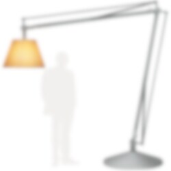 Imponerande och ståtlig golvlampa i matt silver med plisserad tygskärm i naturvit. Lampan ger ett mjukt och behagligt ljus som går att justera med dimmer på sladden. Den påminner om en över-dimensionerad bordslampa och storleken är en iögonfallande detalj i hemmet.