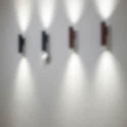 Design: Patricia Urquiola, 2020. Flauta är en samling vägglampor som finns i flera färger, storlekar och med två olika mönster: Riga som har raka linjer och Spiga som har ett sneddat mönster. Den lilla spridningsplattan kan monteras på ovansidan eller undersidan av lampan. Flauta är tillverkad i pulverlackerad aluminium. Har dimmer.