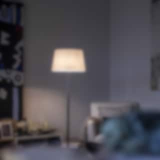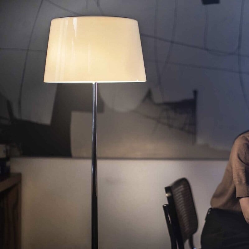 Lampen har en munblåst glasdiffusor med högblank yta som sprider ett mjukt och stämningsfullt ljus, perfekt för vardagsrum, läshörna eller loungeytor. Den stabila foten och stången i kromad metall ger en exklusiv och robust känsla som kompletterar den ljusa, inbjudande skärmen.