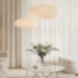 - Noah: En omtyckt och stilren plafond som vi säljer mycket av. Nu har serien utökats med en taklampa klädd i strukturerat bouclétyg som ger ett levande ljus.