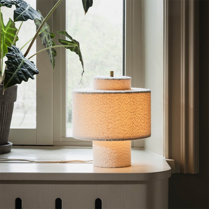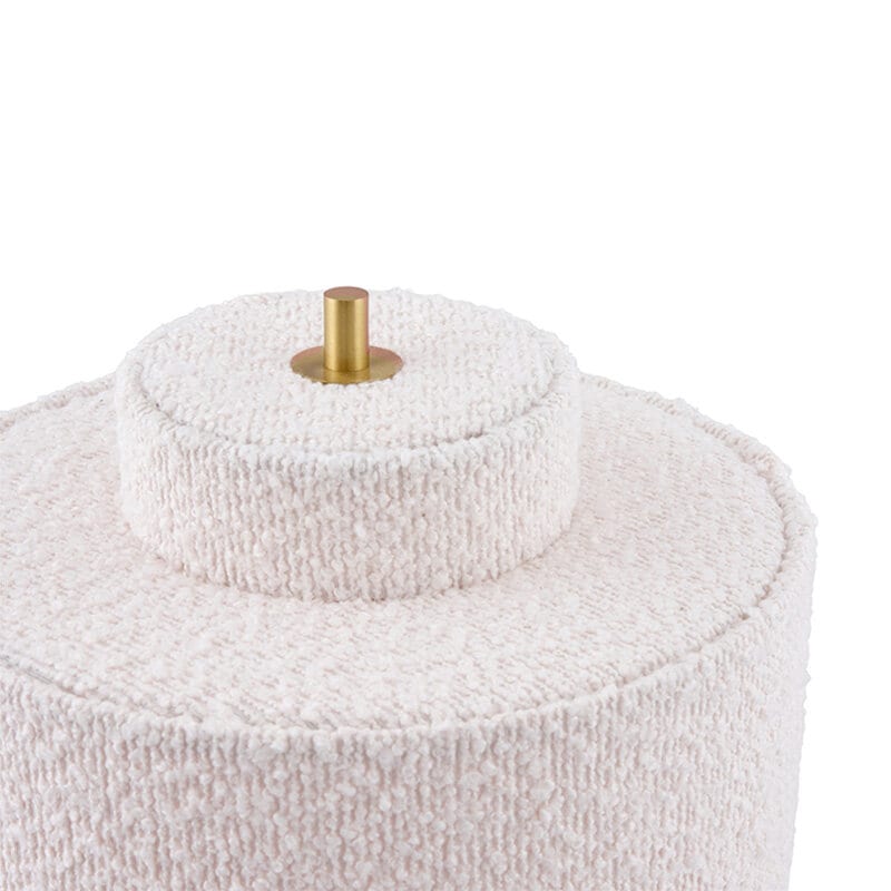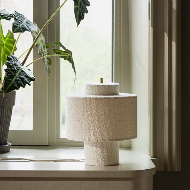 Design: Mikael Holvik. Noah är en handgjord lampa klädd i strukturerat bouclétyg som ger ett levande ljus. De noggrant utvalda detaljerna i äkta mässing förstärker lampans sofistikerade uttryck. Noah är utrustad med bländskydd både i botten och toppen av skärmen, vilket gör att ljuset sprids mjukt och behagligt i rummet. Lampan har en 200 cm lång beige pärlemorfärgad textilkabel med brytare och stickkontakt. Lampan är dimmerkompatibel. Ljuskälla ingår ej.