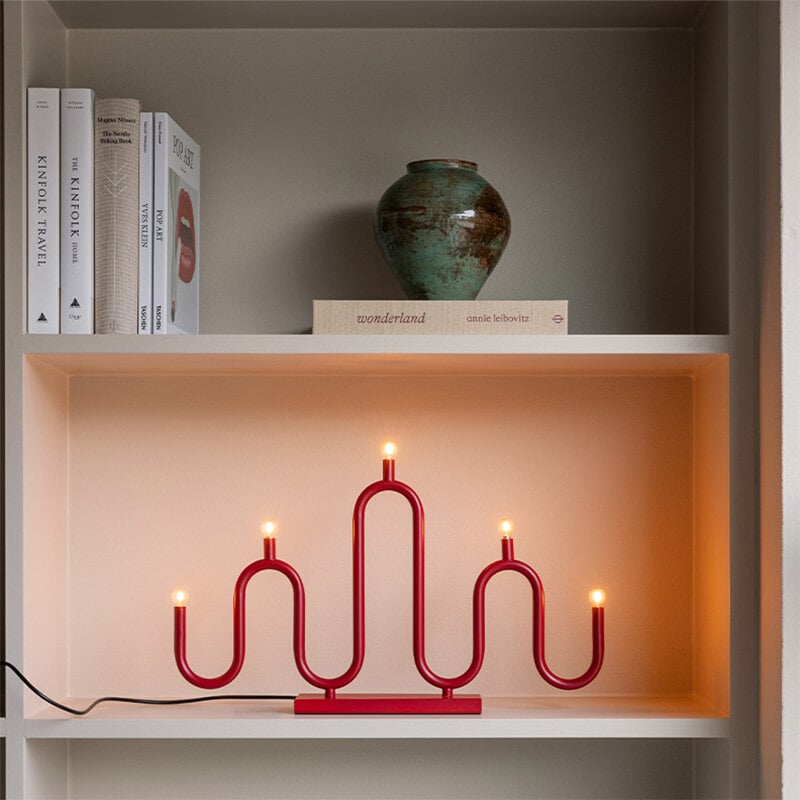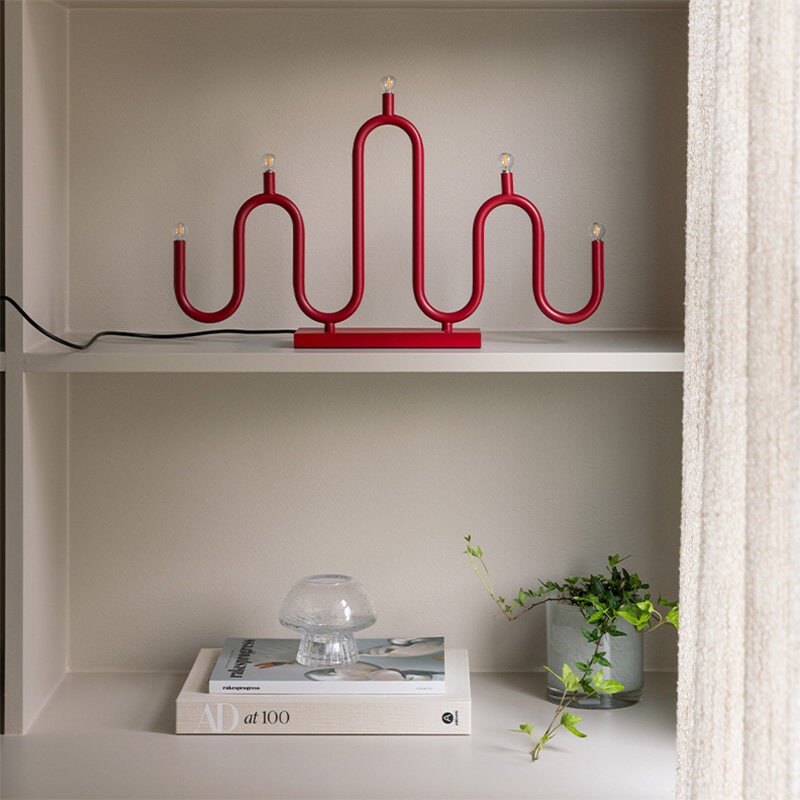 Mikael Holvik. Noel adventsljusstake har ett mjukt och böljande formspråk där varje metallrör bockas för hand i olika nivåer för att skapa den klassiska siluetten av en ljusstake. Med sin eleganta design gör den sig lika vacker i fönstret som på ett sidobord.