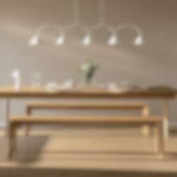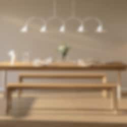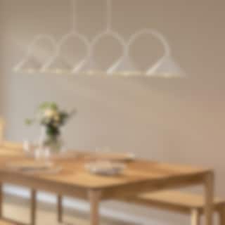 - Noah: En omtyckt och stilren plafond som vi säljer mycket av. Nu har serien utökats med en taklampa klädd i strukturerat bouclétyg som ger ett levande ljus.