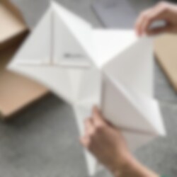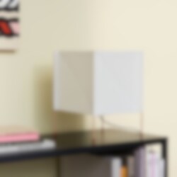 Paper Cube är en serie eleganta och funktionella lampor formade som en kub. Inspirerad av mekaniken i att konstruera vikta pappersdekorationer, kommer Paper Cube i ett platt paket som är lätt att montera. Tillverkad av ett starkt japanskt pappersmaterial av återvunna PET-flaskor och med FSC-certifierade bokben, skapar den genomskinliga skärmen en mjuk omgivande glöd.