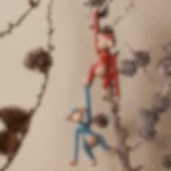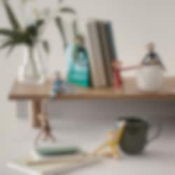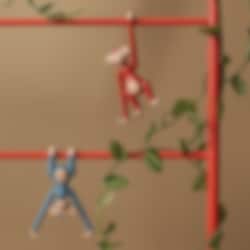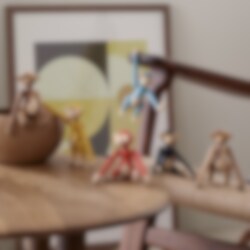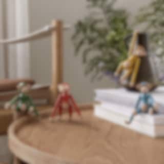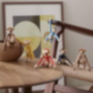 Kay Bojesens ikoniska miniapa här i en nostalgisk vintageröd färg, hämtad från en originaltapet han designade för barnrummet på 1940-talet. Den dämpade röda tonen bjuder på retrovibbar och kontrasterar vackert mot det FSC®-certifierade bokträdets naturliga ytor.