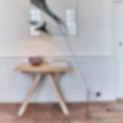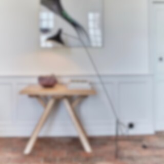Lampan har en lätt industriell design som är en fin balans till dom mjuka runda formerna på skärmen. Trots att den formgavs redan på 50-talet är lampan modern och aktuell i dagens miljöer. Den är väldigt flexibel då foten kan vickas i fyra olika lägen och vridas i 360°, även skärmen är justerbar. Fin att ställa vid soffan, sängen eller vid ett skrivbord.