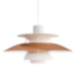 Som en hyllning till Poul Henningsens designklassiker PH 5 lanserades nu en jubileumsutgåva med skärmar i koppar och vitt. Som alla PH lampor är den förses med revolutionerande treskärmssystemet och är helt bländfri och ger ett fint behagligt ljus.