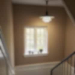 Design: Poul Henningsen.Armaturen avger ett mjukt och behagligt bländfritt ljus som är typiskt för Poul Henningsens reflekterande treskärmssystem. Armaturen finns med vitt opalglas eller svartmålad soft touch-metall med en vit insida. Där metallskärmarna med de vitmålade insidorna reflekterar ett fint och i första hand nedåtriktat ljus, skapar överskärmen i metall i kombination med mellan- och underskärmarna i genomskinlig munblåst opalglas i tre lager ett varmt sken även runt pendeln. Den medföljande avskärmningen i frostat glas är smidig att sätta in för en ännu mjukare ljusfördelning.