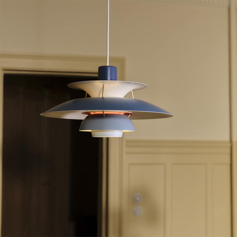 PH 5 formgavs 1958 som ett resultat av de ständiga ändringarna av glödlampans storlek och form. Poul Henningsen konstruerade en lampa där man kunde använda alla sorters ljuskällor. Oavsett hur högt lampan hänger och vilken ljuskälla som används är och förblir PH 5 fullständigt bländfri, vilket är Poul Henningsens signum. Armaturen fick sitt namn på grund av huvudskärmens diameter på 50 cm och har förgyllt kök och andra utrymmen med sitt vackra jämnt spridda sken. "Hues of"-serien av lampan har tagits fram på ett lekfullt sätt i samarbete med färgexperten Louise Sass. Längst upp är färgen mörkast och sedan blir den ljusare skärm för skärm.