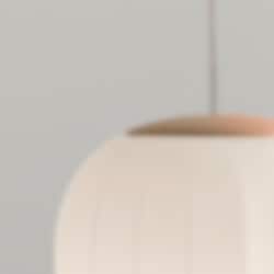 Lita har en tidlös design i blåst opalglas med matt yta och lätta vertikala spetsar. Glasgloben kombineras med en trästruktur i ask, vilket gör Lita till en produkt med en kraftfull materialkaraktär.