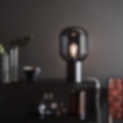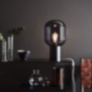 Brooklyn är en modern bordslampa med fot i svart metall och kupa i rökfärgat glas. Med en höjd på 44 cm passar den lika bra på ett sidobord, i fönstret eller i en hylla. Det färgade glaset sprider ett härligt sken som man inte vill vara utan..