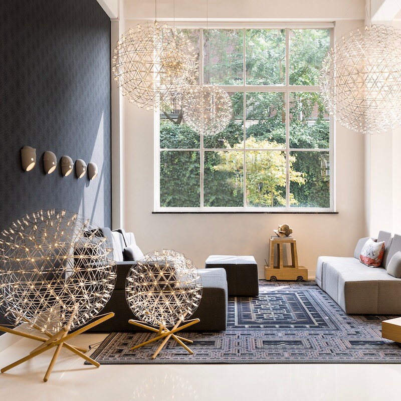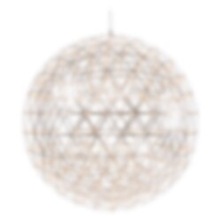 Design: Raimond Puts, 2009. Raimond-lamporna är perfekta sfärer uppbyggda av matematiska principer, där små LED-ljuspunkter bryter igenom konstruktionen och skapar ett skimrande uttryck. Inspirationen hämtas från den geodetiska kupolens struktur och fascinationen för primtal, vilket återspeglas i lampornas proportioner och dimensioner. Resultatet är en harmonisk balans mellan teknik, form och poesi. En ljusskulptur som för tankarna till en stjärnklar natthimmel och tillför rummet en känsla av både precision och magi.