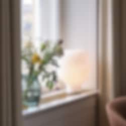 Strand bordslampan refererar till designhistoria samtidigt som den förblir distinkt modern. Dess form är mjuk och lekfull, en skulpturell design utrustad med en dold ljuskälla som lyser upp hela dess monolitiska form.