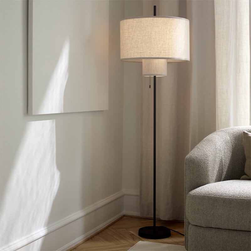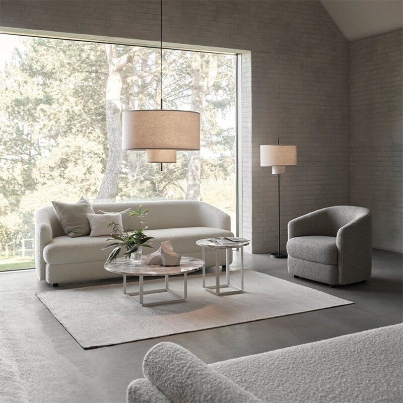 Margin är en modern tolkning av den klassiska armaturen, där ett lageruppbyggt formspråk står i centrum. De överlappande skärmarna samverkar för att mjukt filtrera ljuset och skapar omedelbart en varm och taktil stämning i rummet. Textilens mjukhet balanseras av en ren och grafisk silhuett som ger lampan både volym och närvaro. Det är de väl avvägda proportionerna och genomtänkta detaljerna - som det linjära elementet som löper genom lampan - som förfinar uttrycket och låter Margins unika karaktär träda fram.