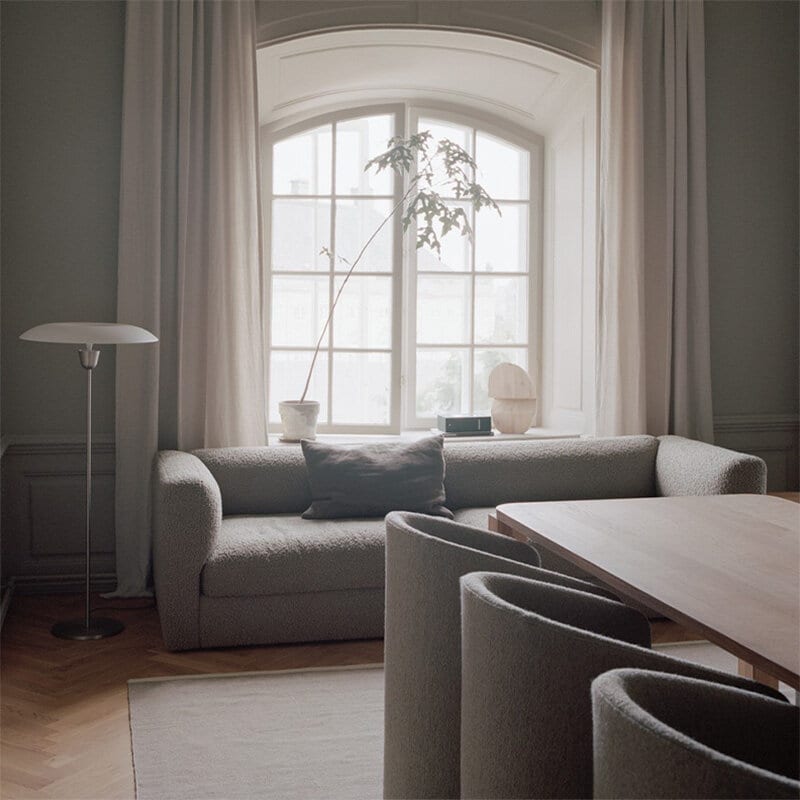 Kantarell golvlampa omtolkar klassiska arketyper genom sin mjukt konturerade silhuett och tekniska elegans, vilket ger lampan ett uttryck med tydlig, tidlös potential. Reflektorn fungerar som en inverterad tratt och sprider ljuset effektivt utåt från den nästintill dolda ljuskällan i centrum. Ljuset tänds och släcks med en enkel beröring via en diskret integrerad knapp, vilket ger en intuitiv och behaglig användarupplevelse. Drivdonet är elegant dolt vid stickproppen, vilket bidrar till ett extremt rent och strömlinjeformat uttryck präglat av precision och mjuka linjer.