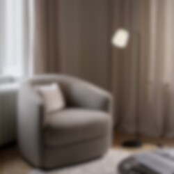 Design: Noergaard & Kechayas 2022.Lampserien Material från New Works har en enkelhet i sin design men utmärker sig med naturliga material som tillför värme och ett ombonat intryck i interiören. Den eleganta svarta foten har mjuka övergångar i detaljer och fogar som skapar en elegant helhet. Lampskärmen är vridbar och gör det möjligt att justera i önskad riktning. Det direkta ljuset gör den perfekt för läsning vid fåtöljen, soffan eller sängen.