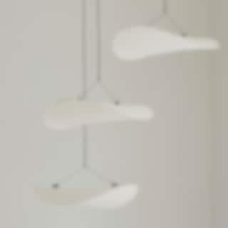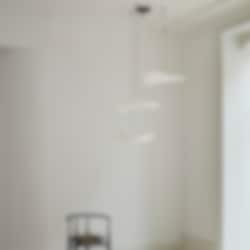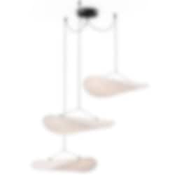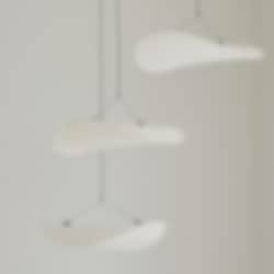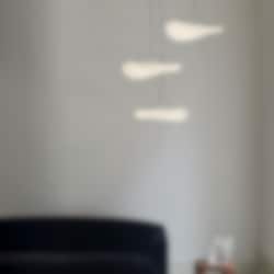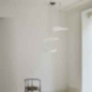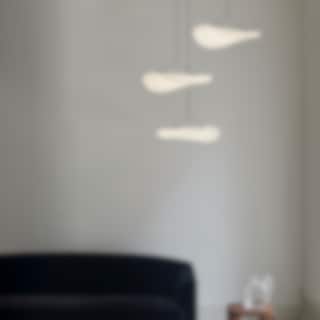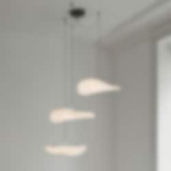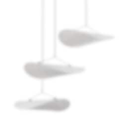 Tense chandeliere taklampa utgör en fin formation av 3 takpendlar i 55 cm diameter som skapar ett sofistikerat alternativ till den klassiska ljuskronan. Tre skärmar dyker upp i en enad konstellation, smälter samman till ett enat voluminöst men viktlöst uttryck. Dessa nyanser, gjorda av Tyvek, speglar kännetecknet för Tense-serien, sprider en mild luminans från både toppen och botten.