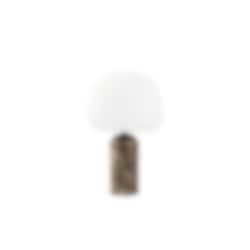 Lampan har fina materialval i munblåst opalt glas och en fot i brun emperador-marmor.