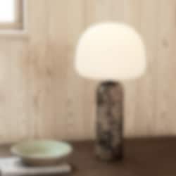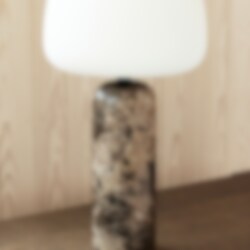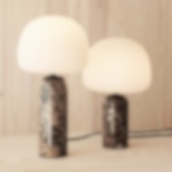 Lampan har fina materialval i munblåst opalt glas och en fot i brun emperador-marmor.