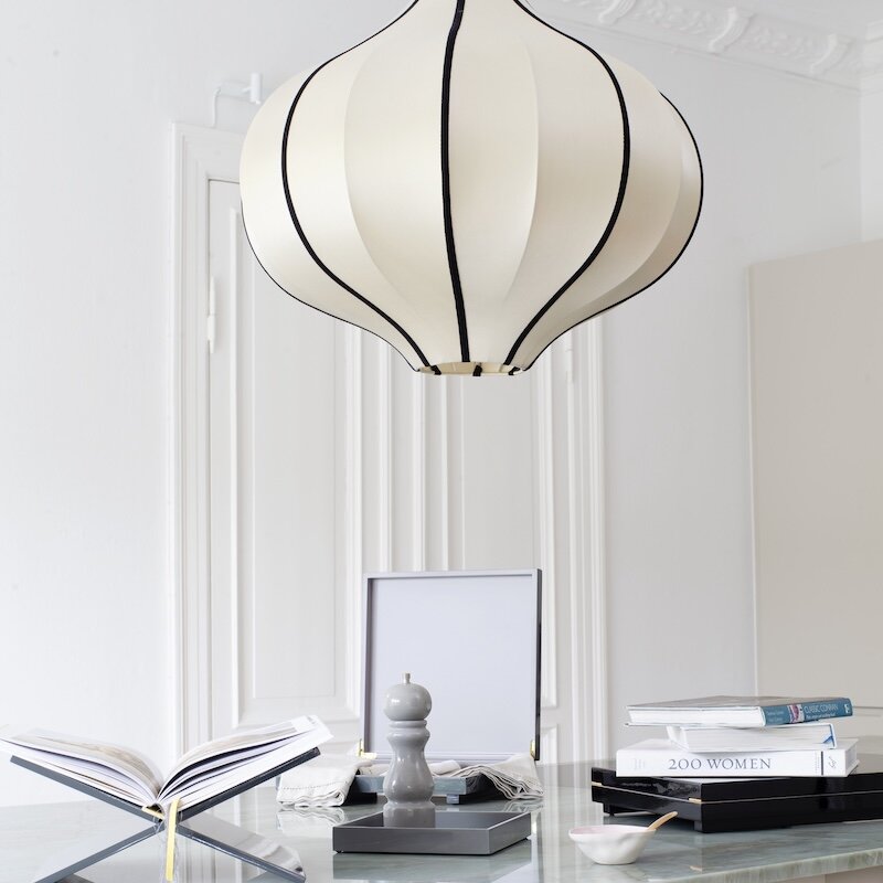 Indochina Ufo, som fått namnet efter sin form liknande ett flygande tefat. Det är en oerhört vacker lampa i tjockt siden med dekorativa bomullsband som ger ett mjukt och fint sken. Indochina serien kombinerar det bästa från två världar med den rena, enkla skandinaviska stilen och den exotiska stilen från Asien. En handgjord, unik lampa med personlighet som sätter prägel på ett helt rum.