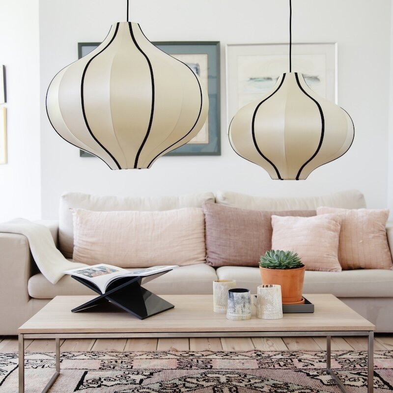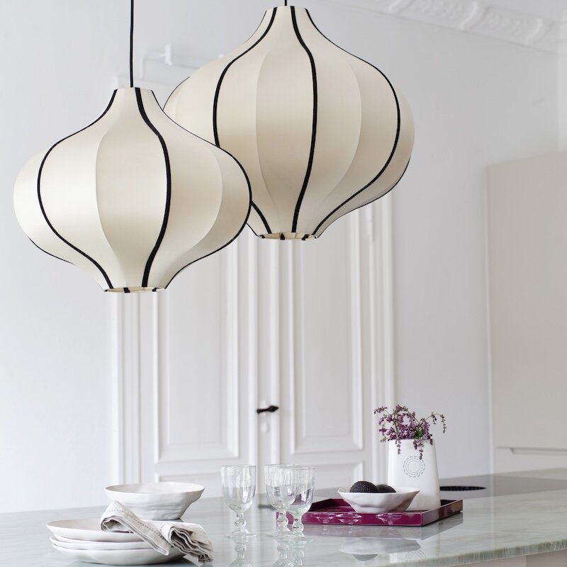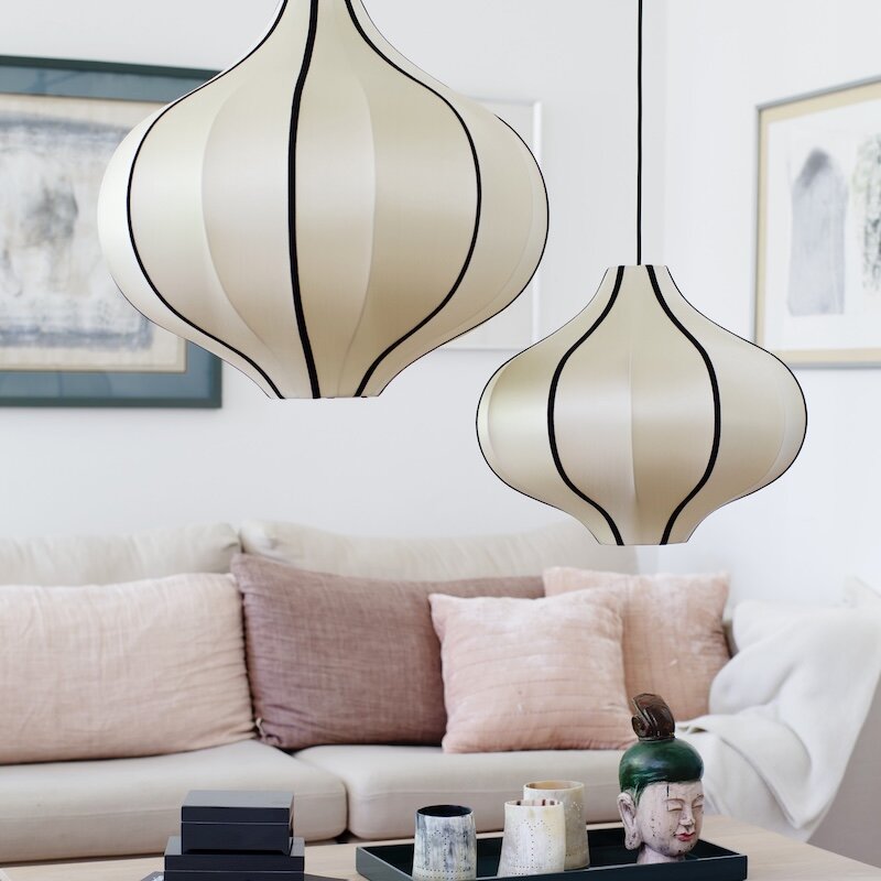 En omåttligt populär modell hos oss är lampskärmen Indochina Ufo, som fått namnet efter sin form liknande ett flygande tefat. Det är en oerhört vacker lampa i tjockt siden med dekorativa bomullsband som ger ett mjukt och fint sken. Indochina serien kombinerar det bästa från två världar med den rena, enkla skandinaviska stilen och den exotiska stilen från Asien. En handgjord, unik lampa med personlighet som sätter prägel på ett helt rum.