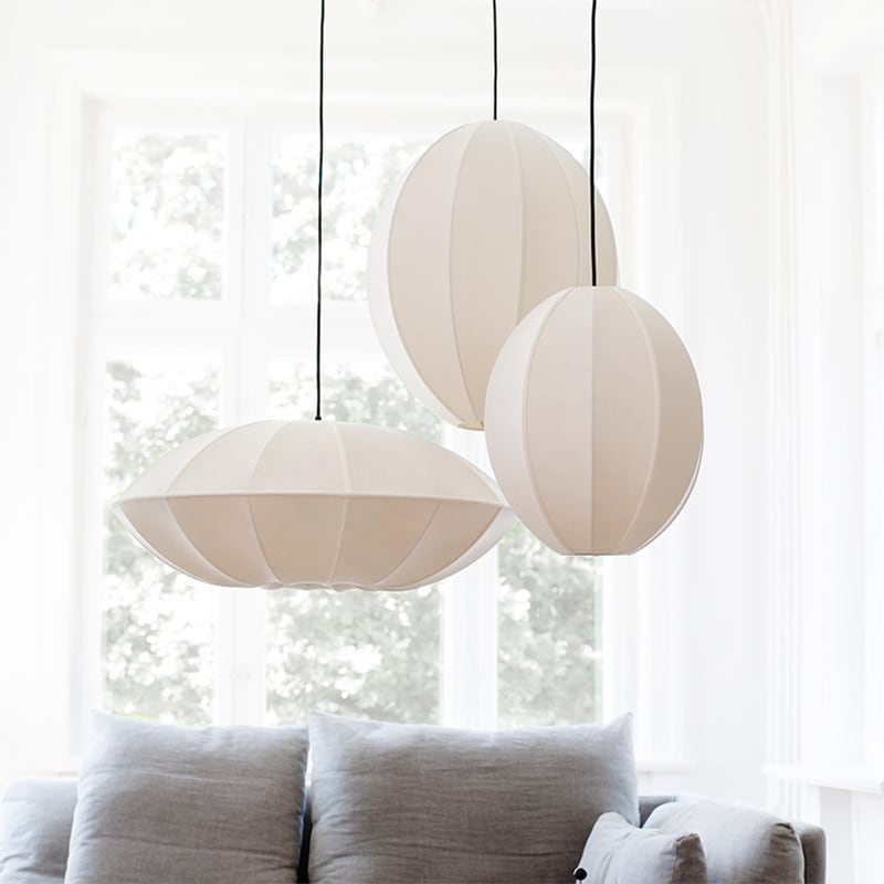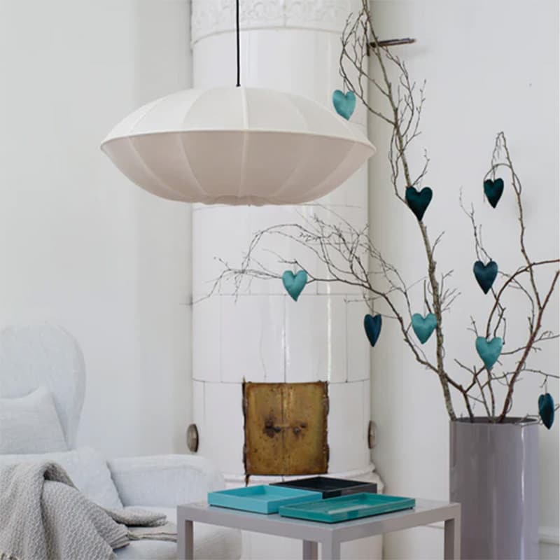 Indochina Ufo, som fått namnet efter sin form liknande ett flygande tefat. Det är en oerhört vacker lampa i tjockt siden med dekorativa bomullsband som ger ett mjukt och fint sken. Indochina serien kombinerar det bästa från två världar med den rena, enkla skandinaviska stilen och den exotiska stilen från Asien. En handgjord, unik lampa med personlighet som sätter prägel på ett helt rum.