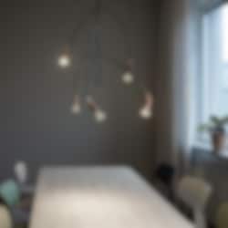 Ranka 5 taklampa olivgrön är formgiven av Jonas Bohlin och en hyllning till naturens estetik och har därför en organisk och rund form. Namnet Ranka kommer från det svenska ordet vinranka, vilket utgör inspirationen till denna eleganta design. Taklampan finns i två storlekar med antingen fem eller sju ljuskällor, vilket gör den perfekt för att hänga över matbord eller mötesbord. Denna modell kommer med fem armar. Lampan kommer med en 250 cm lång textilladd och finns att välja i flera olika färger.