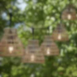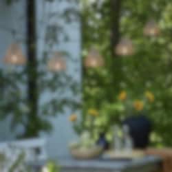 Flex Out ljusslinga för utomhusbruk (IP44) med 5 st lamphållare. Totallängd 6,5 m, 2,5 m till första lamphållaren, sedan 80 cm mellan varje lamphållare. 15 cm från T-koppling ner till skärmring. Slingan kommer i hop med 5 st Sarah lampskärm i naturmaterial. Skärmen är 18 cm bred och 18 cm hög. Tänk på att skärmen är gjord av ett naturmaterial och att väder och vind kan komma att påverka utseendet.