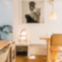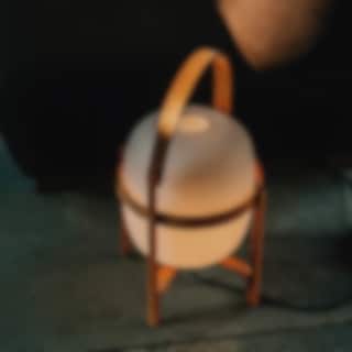 Lampan är lättplacerad oavsett om den står på ett bord, i en hylla eller på golvet. Materialen är klassiska och rena i opalglas och körsbärsträ.