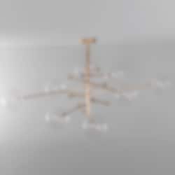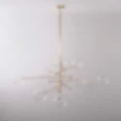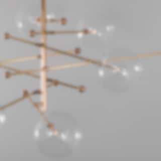 Lampan har en minimalistisk modern design som passar utmärkt över köksbordet eller i vardagsrummet. Den är gjord i solid mässing och har 8 munblåsta glasglober som sitter längst ut på armarna.