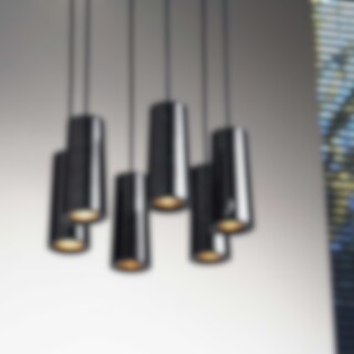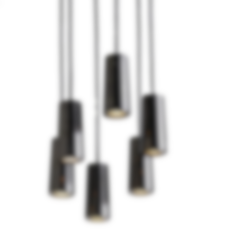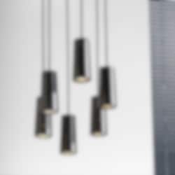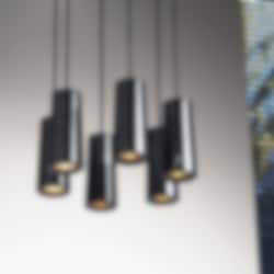 Core Marquina klusterlampor med 6 eleganta cylindriska pendellampor, framställd av solid italiensk svart Marquina marmor. Den är perfekt vid trappområden, över matbordet eller i ett hörn av vardagsrummet där det kommer att göra intryck både med och utan ljus.