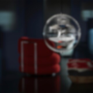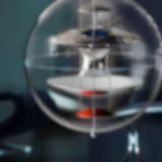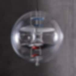En fantastisk belysning med ett system av olikfärgade reflektorer i krom, vitt, blå och orange, inneslutna i en sfär som ger ett fint bländfritt ljus.