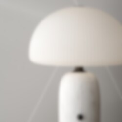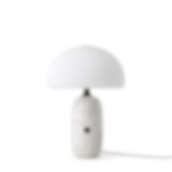 En hållbar LED-enhet är gömd under en trelagers skärm av opalglas, vilket ger en mysig belysning. Den runda cylinderbasen av antingen grå eller vit marmor har en dimmer och en tygklädd sladd.